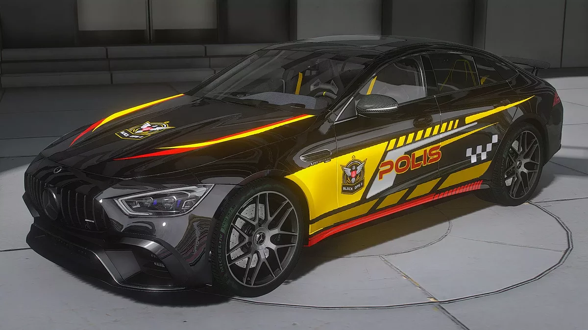 梅赛德斯-AMG GT 警察黑色行动,适用于GTA 5。 前部: 引擎盖装饰有哑光黑色和光泽黄色的细节,以及“黑色行动”标志,赋予汽车一种激进而独特的外观。 标志性的Panamericana格栅配有垂直黑色条片,突显了AMG的身份,并增强了运动感。 锐利的LED大灯与生动的图形设计赋予前脸科技感和现代气息。 大型前保险杠配有空气动力学元素和大尺寸进气口,突显了动态和赛车风格。 侧面: 对比色的双色涂装:深黑色与亮黄色面板,辅以红色和白色细节,形成引人注目的独特形象。 ...