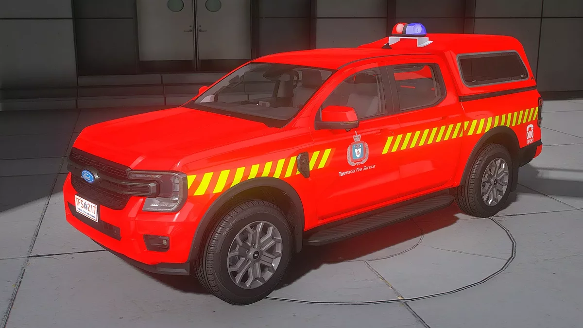 2023 福特 Ranger XLT TFS 7.2 适用于 GTA 5。 前部: 引擎盖涂成鲜艳的红色,使汽车显眼并突显其服务用途。 中央大型福特标志的黑色格栅赋予外观现代感和稳重感。 大尺寸 LED 大灯具有独特的图形,提供出色的可见性,突显了该车型的科技感。 车顶装有红蓝闪光灯的信号灯条,强调其紧急服务的身份。 侧面: 车身采用鲜艳的红色,配有黄色斜条纹,确保车辆在道路上的高可见性。 车门上印有“塔斯马尼亚消防服务”的徽章和标识,以及服务标志和徽标。 宽...