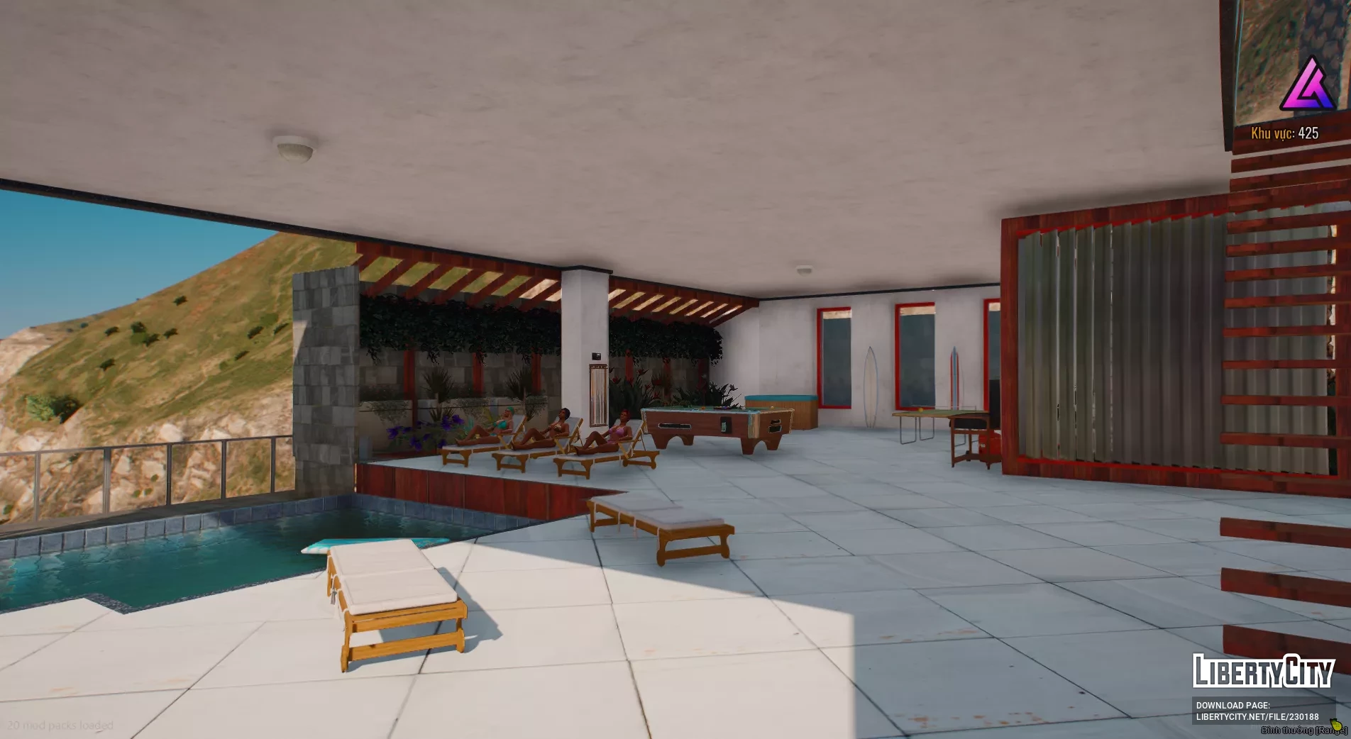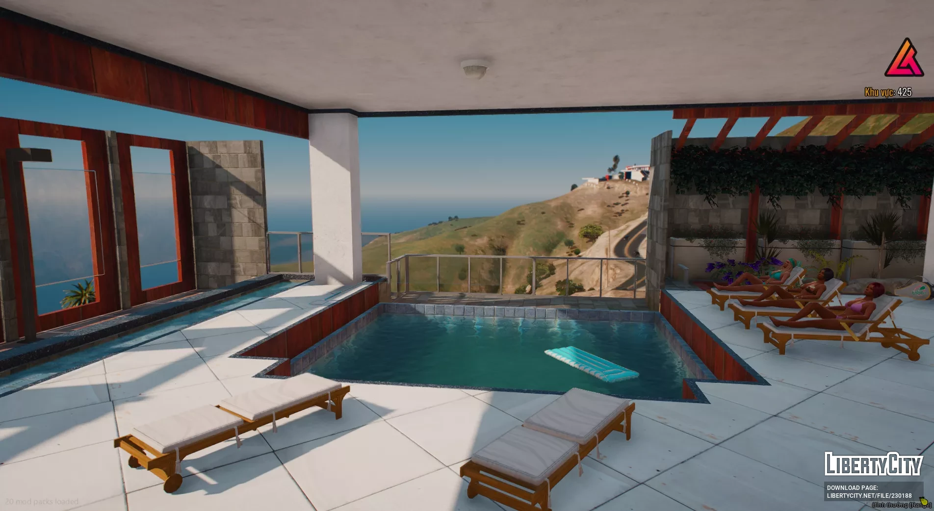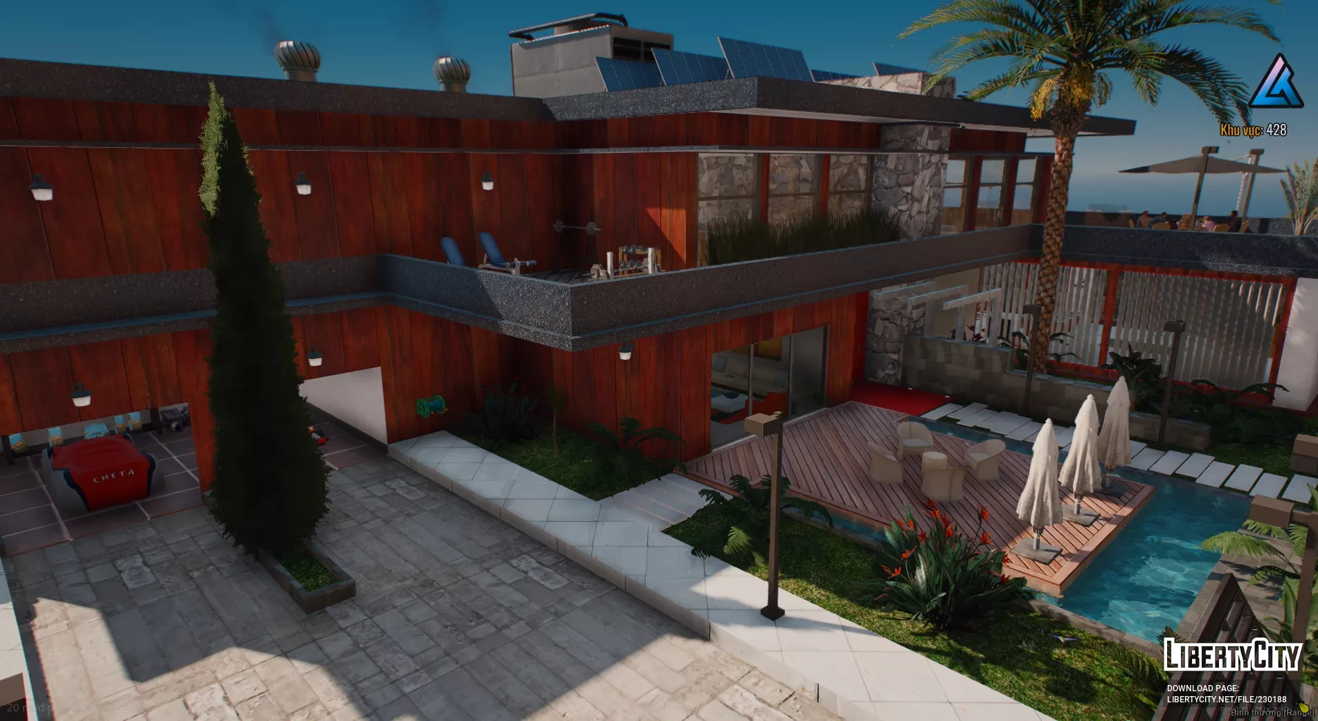 Современный особняк в стиле мафии расположен на склоне с потрясающим видом на океан. Дом выполнен в строгом и лаконичном архитектурном стиле: прямые линии, плоская крыша, большие панорамные окна и просторные террасы. Фасад сочетает натуральный камень, бетон и стекло, что придаёт зданию солидность и современность. Перед входом — ухоженная дорожка, окружённая высокими декоративными кустами, а также массивные ворота, обеспечивающие приватность. Территория огорожена высоким забором, внутри — пальмы и зелёные насаждения, создающие атмосферу роскоши и уединения. На крыше установлены солнечные панели, подчёркивающие технологичность дома. На террасе расположена зона отдыха с мебелью и зонтами — идеальное место для встреч и переговоров в стиле мафии.