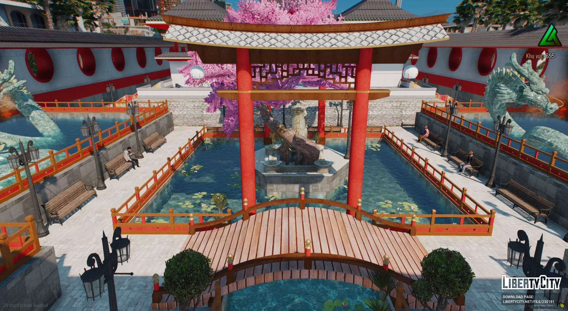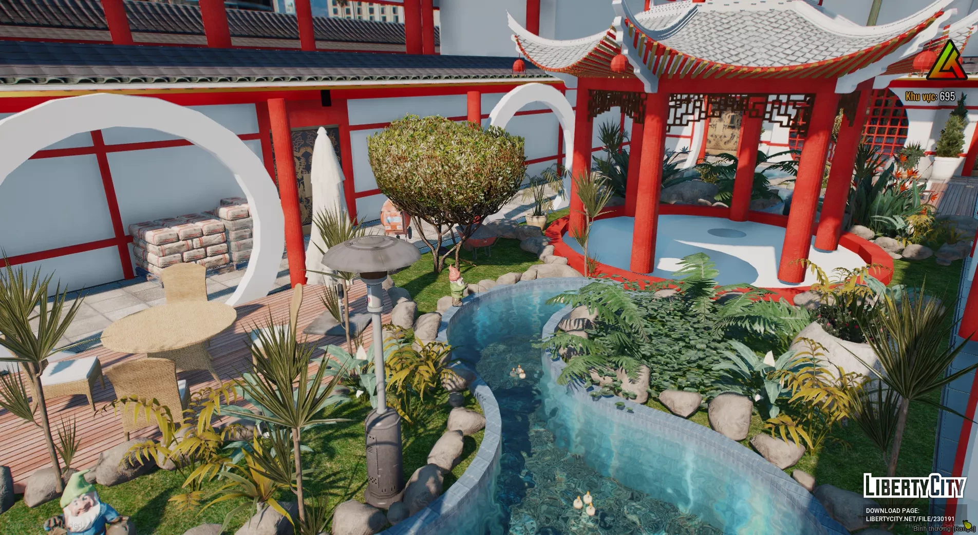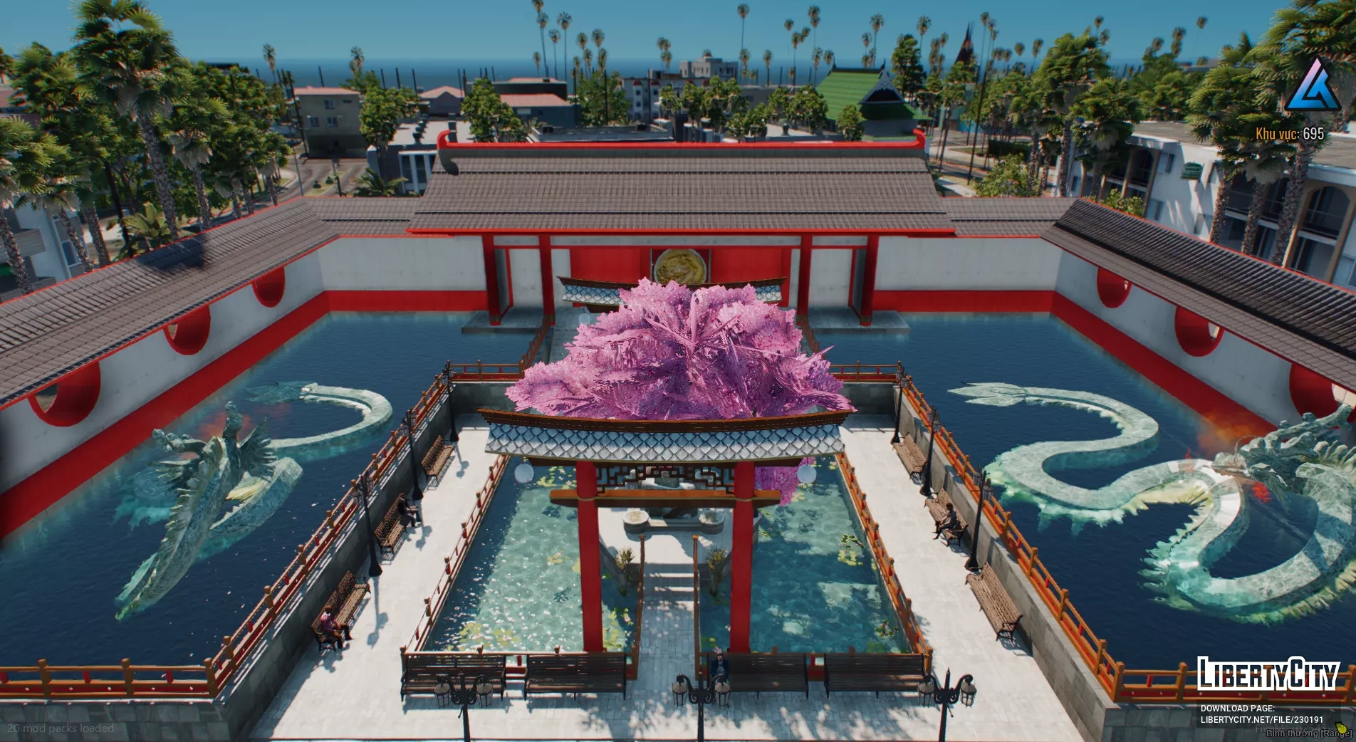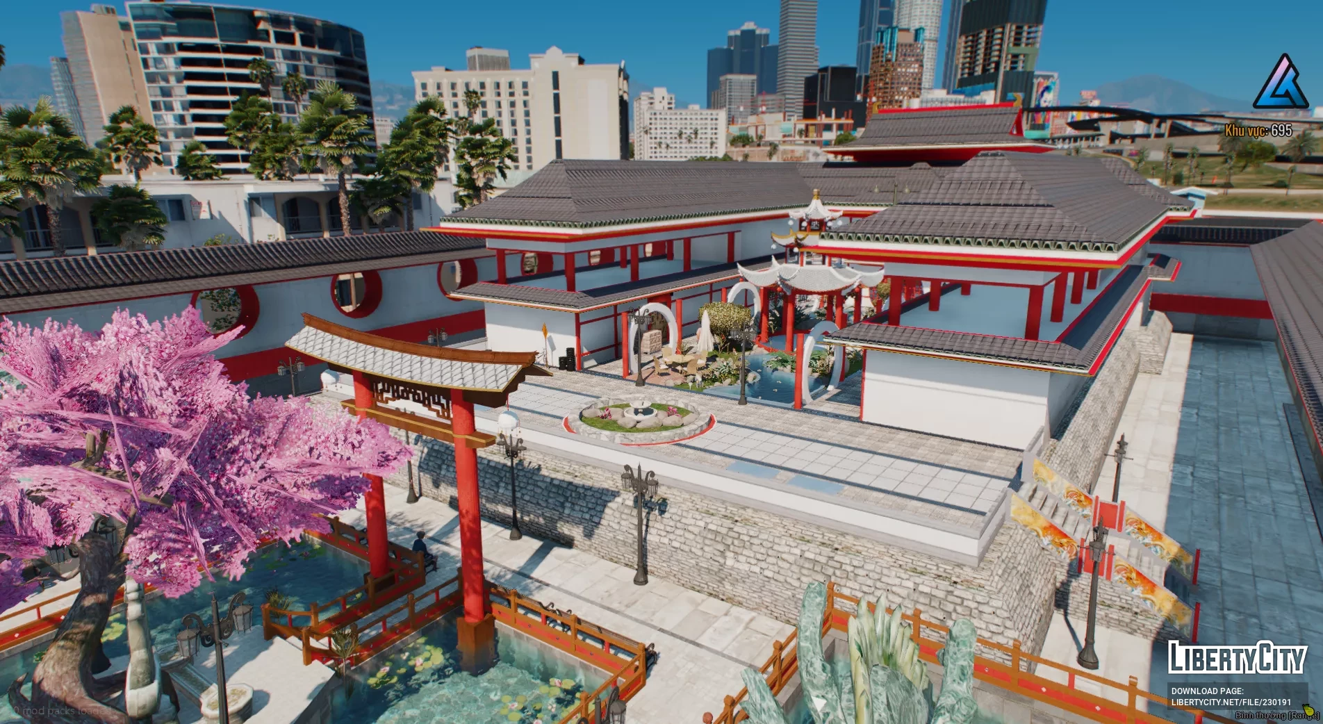 Здание выполнено в стиле восточного храма. Основной корпус окружён массивными стенами и водоёмами, в которых расположены декоративные фигуры драконов. На входе возвышается большая арка с традиционной крышей, а в центре двора находится яркая розовая сакура, которая подчеркивает атмосферу уединения и гармонии. Крыши здания покрыты тёмной черепицей с красными акцентами по краям. Вся территория выглядит ухоженно и строго симметрично, что придаёт комплексу величественный и гармоничный вид. Вокруг храма растут пальмы, подчёркивая экзотичность архитектуры.