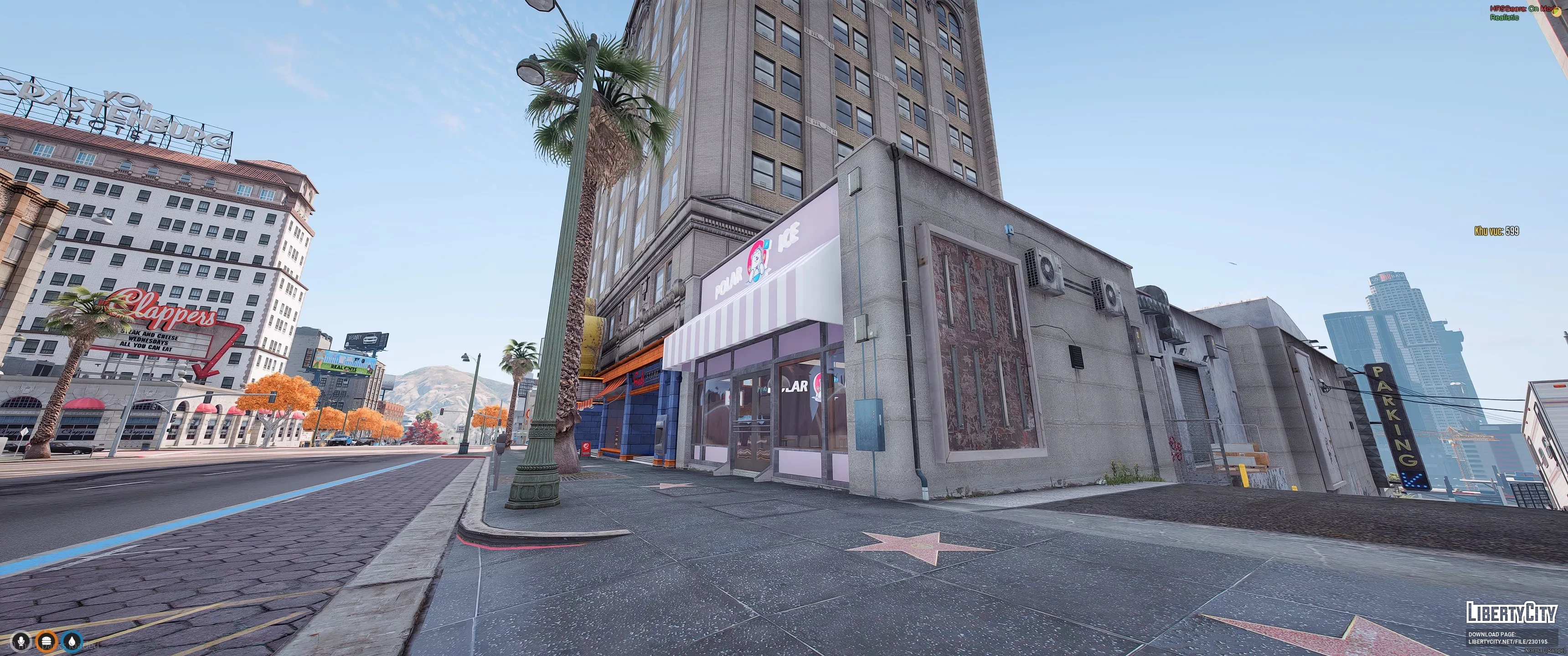 Большие витринные окна позволяют видеть интерьер кафе, а сам фасад оформлен просто и современно. Кафе находится на оживлённой улице, рядом с другими магазинами и зданиями в классическом стиле. На тротуаре перед входом растёт пальма, а также установлены парковочные столбики и уличный фонарь. Общий стиль заведения — яркий, современный и дружелюбный, идеально подходящий для семейного кафе-мороженого.
