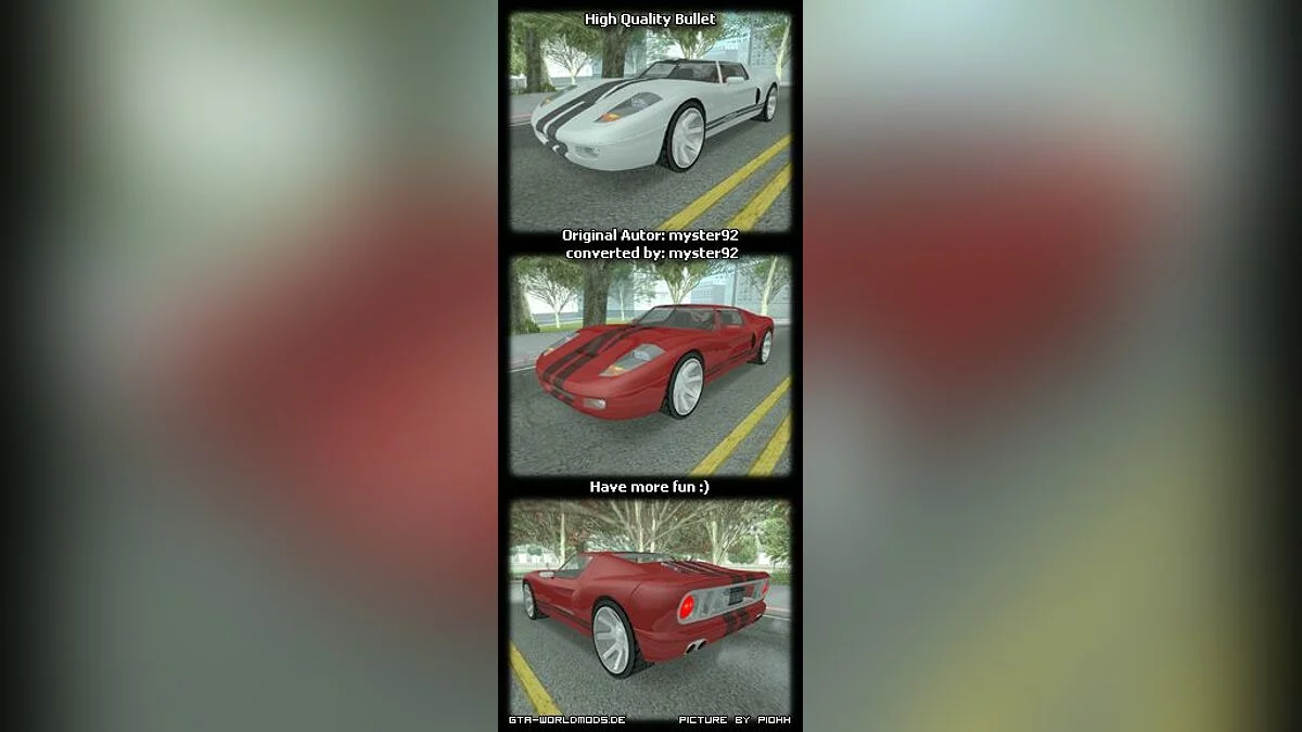 特点: - 模型支持游戏的主要功能; - 来自GTA V的高质量3D模型; - 高质量的轮胎和轮圈; - SA车牌,污垢; - 中等质量的内饰; - 车身部件有损坏; - 模型与ImVehFt (DK22Pac)模组兼容。